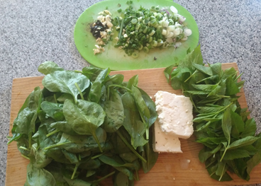 Die Kräuter und den Spinat waschen, trockenschleudern und Streifen schneiden. Knoblauch und Zwiebel schälen, fein hacken.